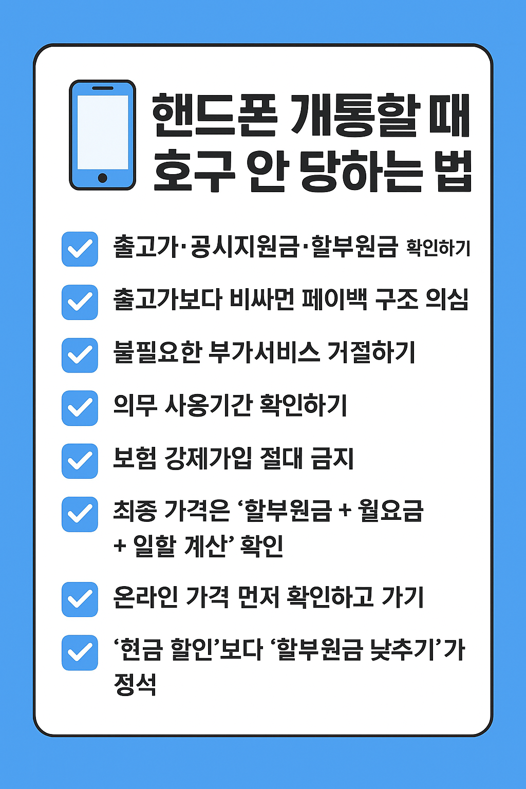 📱 핸드폰 통신사 개통 vs 자급제 비교핸드폰 구매 시 흔히 듣는 통신사 개통과 자급제의 차이를 상세히 정리했습니다. 어떤 방식이 나에게 맞는지 한눈에 비교해보세요.1️⃣ 통신사 개통통신사와 함께 단말기를 등록하고 개통하는 방식입니다. 통신사 약정 가능: 24~36개월 약정 후 요금 할인(공시지원금 등) 공시지원금: 통신사에서 지원하는 보조금으로 단말기 가격 부담 감소 편리함: 유심, 요금제, 개통까지 한 번에 처리 가능 단점: 약정으로 통신사 변경 제한, 요금제 선택 폭 제한 가능2️⃣ 자급제단말기만 구매하고, 원하는 통신사의 유심을 꽂아 사용하는 방식입니다. 자유로운 통신사 선택: SKT, KT, LGU+, 알뜰폰 등 자유롭게 선택 요금제 자유도: 저가 요금제, 선불폰, 알뜰폰 자유롭게 ..